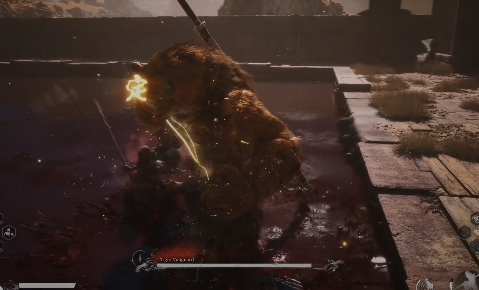 Тигр уклоняется назад, а затем наносит косой удар катаной. Это самая опасная способность Тигра Авангарда. Изначально она хорошо отработана: он держит катану в ножнах, готовится к атаке и невероятно быстро бросается на вас, практически без анимации. От этой способности очень сложно увернуться, особенно если вы находитесь в зоне ближнего боя, поэтому отступайте, если видите, что босс отпрыгивает назад, а затем приготовьтесь уклониться от удара катаной в последнюю секунду.