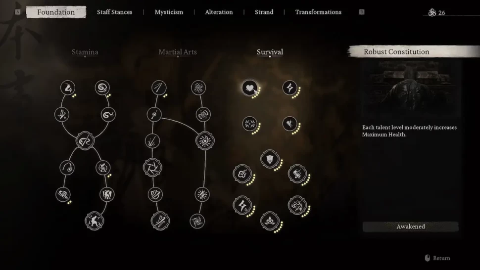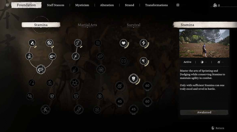 Обезьянья Ловкость - одно из самых полезных умений в игре, поскольку оно дает пассивное, но критически важное преимущество, снижающее расход выносливости. В частности, оно снижает расход выносливости при уклонении, которого вам придется делать очень много, сражаясь с врагами и особенно быстрыми боссами, такими как Тигр Авангарда. Поэтому необходимо как можно скорее открыть это умение.
