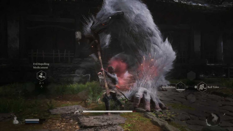 Иногда босс ни с того ни с сего начинает лизать свою руку. Если вы находитесь рядом с боссом, это отличная возможность для атаки, так как после облизывания руки босс ничего не делает. Вы должны хорошо использовать заклинание обездвиживания и трансформации босса, чтобы временно поджечь волка.