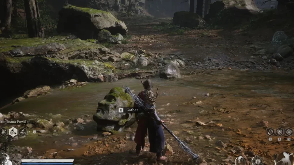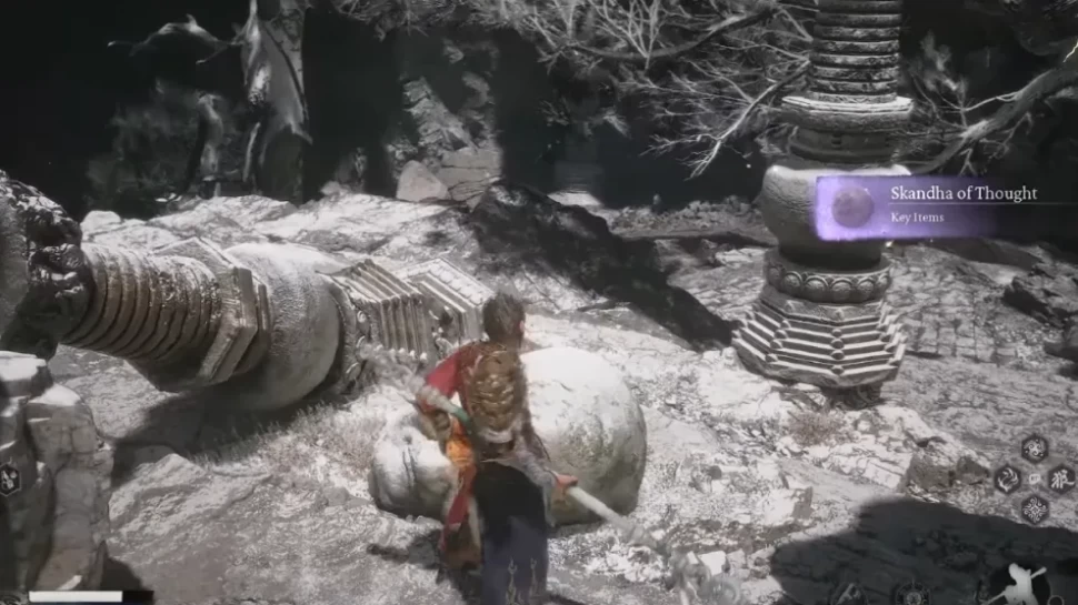 Самую простую скандху найти проще простого; она находится в самом начале игры, как только вы выйдете в открытый мир. Прямо перед учебным боем с бычьей стражей, где вы изучаете заклинание «Обездвиживание», вы могли видеть обезьяну, которая увидит вас и убежит с левой стороны. Здесь вы найдете голову Будды, взаимодействие с которой наградит вас скандхой формы.