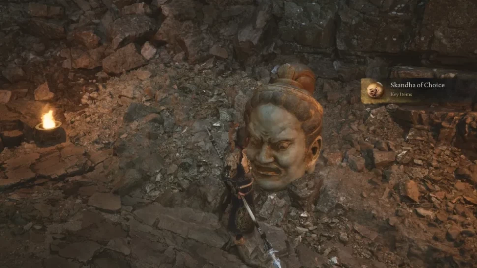 Последнюю скандху найти тоже несложно - для этого нужно просто нормально продвигаться по сюжету 4-й главы, пока не дойдете до запоминающегося боя с боссом. Как только вы разблокируете святилище Очищающего источника, отправляйтесь вперед в следующую зону и посмотрите в левую часть карты. Вы увидите каменную голову Будды, на вершине которой сидит таинственная обезьяна. Он исчезнет, и вы сможете получить Скандху выбора.