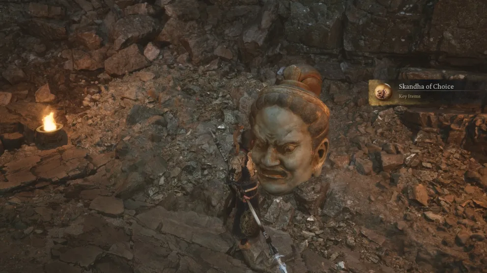 Самую простую скандху найти проще простого; она находится в самом начале игры, как только вы выйдете в открытый мир. Прямо перед учебным боем с бычьей стражей, где вы изучаете заклинание «Обездвиживание», вы могли видеть обезьяну, которая увидит вас и убежит с левой стороны. Здесь вы найдете голову Будды, взаимодействие с которой наградит вас скандхой формы.