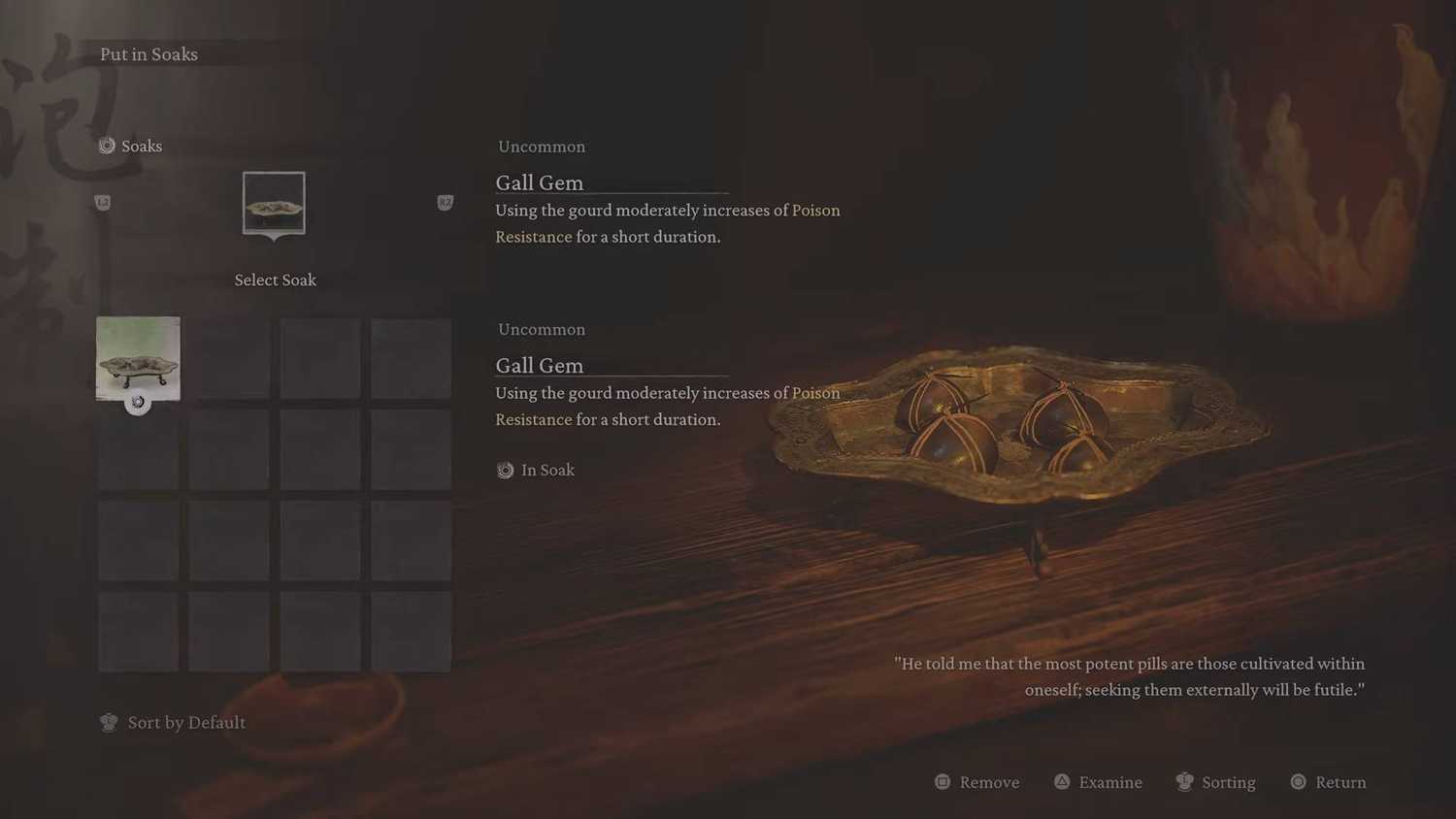 Драгоценный камень Галла, автоматически получаемый после сцены, на некоторое время повысит вашу сопротивляемость яду после того, как вы выпьете целебный напиток. Это было бы очень полезно, когда вы сражались с многочисленными змеями Гуай в Бамбуковой роще до этого момента.
