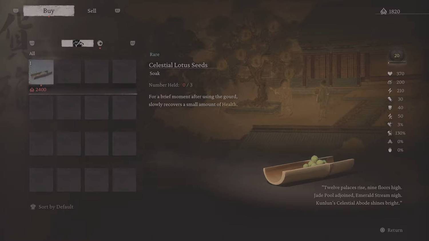 В магазине Shen Monkey также продаются семена небесного лотоса, которые вы можете использовать в качестве пропитки. Они обойдутся вам в 2 400 воли, но зато дают эффект восстановления здоровья с течением времени, который может оказаться полезным в более трудных боях. К этому моменту у вас уже должно быть много золота, поэтому при необходимости продайте его Обезьяне Шэнь, чтобы как можно скорее получить этот предмет.