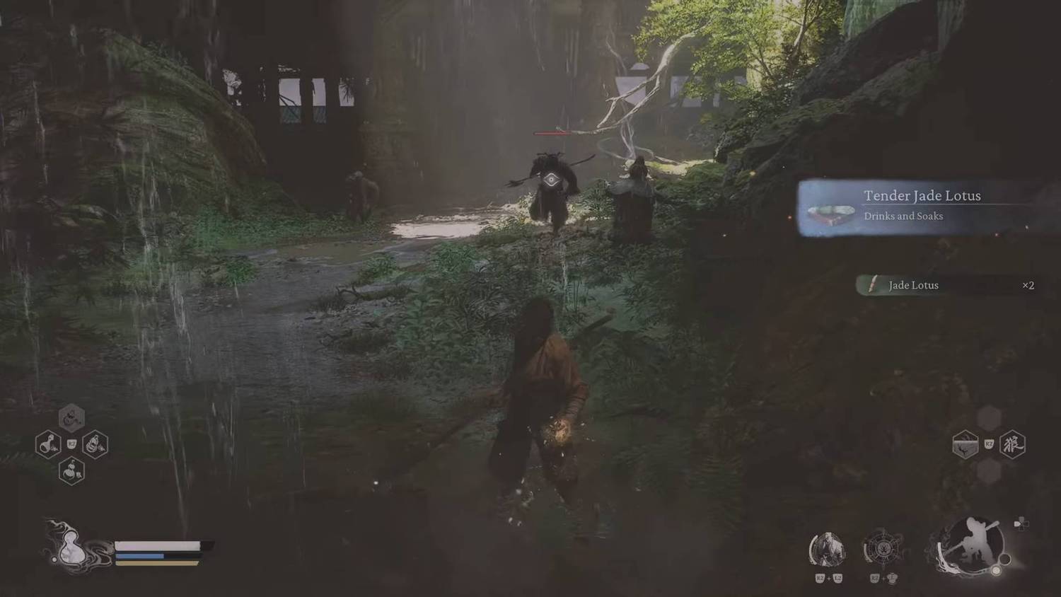 Вы откроете пропитки после встречи с обезьянкой Шэнь, на которую напал Змей Гуай в конце Бамбуковой рощи. После победы над ним появится сцена, в которой он приглашает вас присоединиться к нему в соседней пещере и упоминает, что змеиная желчь хороша, если ее «выпить». Примите его предложение и отправляйтесь в пещеру, где он выступает в роли торговца и может улучшить вашу горлянку. Здесь же можно применить замачивание в целебном напитке, а встреча с обезьяной Шен также разблокирует эту способность во всех святилищах.