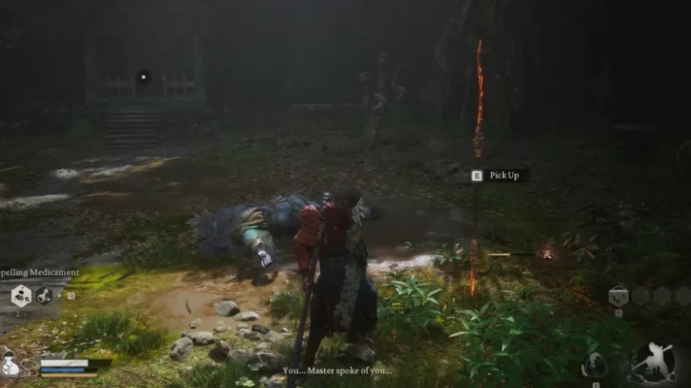 Первое заклинание превращения можно пропустить, так как это не сюжетный бой с боссом. Чтобы открыть заклинание трансформации, вам нужно сразиться с волком Яогуай Гуанчжи и забрать его оружие. Оно позволит вам временно превращаться в Гуанчжи и наносить разрушительные огненные удары. Найти его можно в дальнем конце карты рядом со святилищем «За пределами леса».