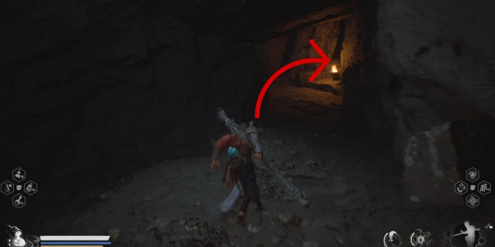 Держитесь ближе к левой стороне, и вы заметите трещину в стене. Пройдите через нее и бегите прямо вверх по лестнице, чтобы найти место для медитации. Теперь повернитесь на 180 и начните спускаться обратно, но следите за правой стороной - там будет путь, освещенный фонарем.