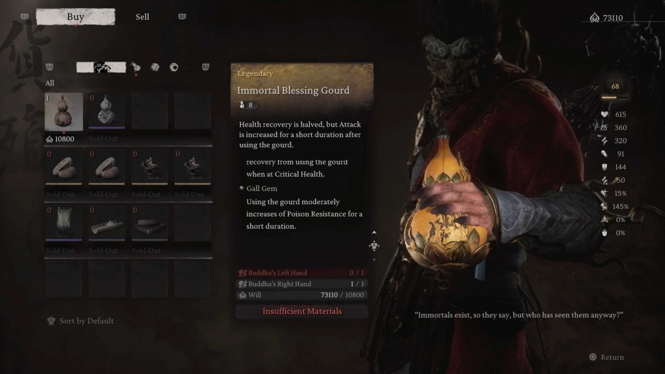 Правая и левая руки Будды необходимы для изготовления одной из лучших горлянок в Black Myth: Wukong. Чтобы изготовить ее, просто посетите Обезьяну Шен, расположенную неподалеку от святилища Хранителя Болота Белого Тумана. Зайдите в магазин и купите Бессмертную благословенную горлянку.