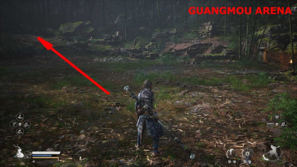 Игроки встретят Гуанмоу, вождя яогуай, на арене в конце Змеиной тропы в Бамбуковой роще. На этой арене есть каменная лестница, по которой игроки могут добраться до деревянной конструкции, в которой находится колокол.