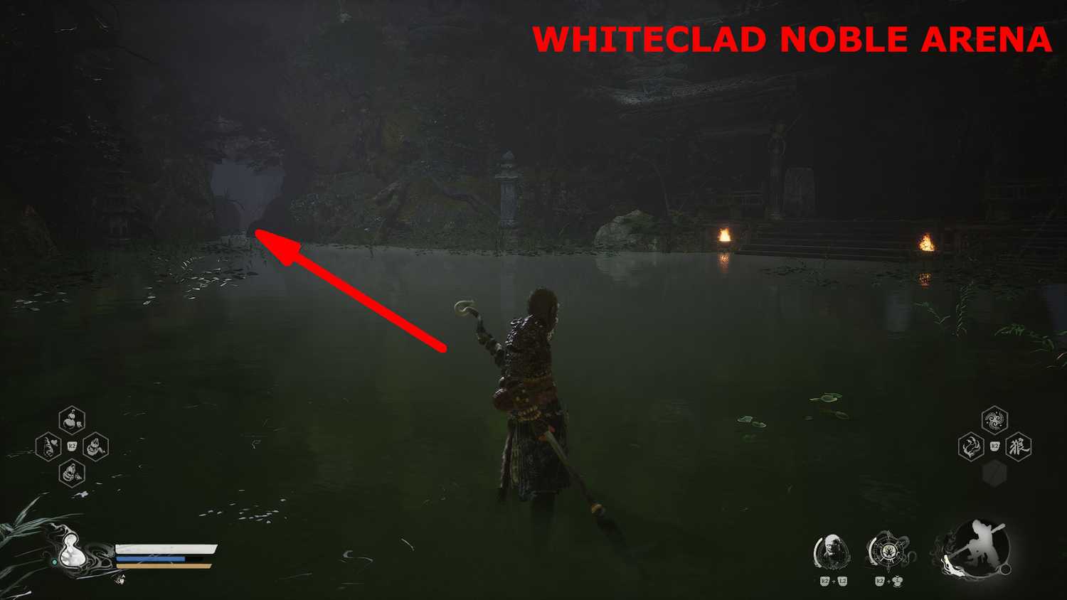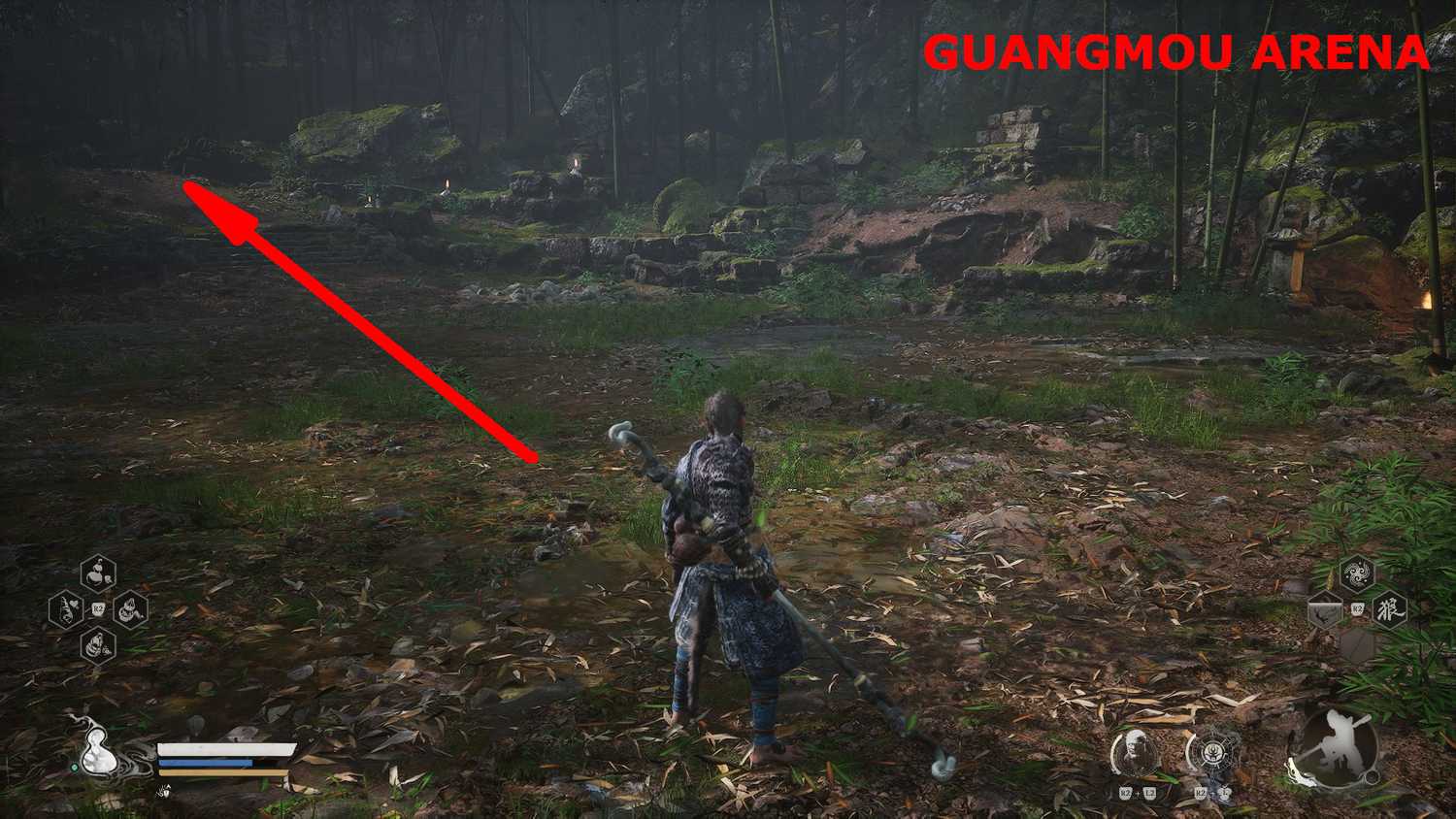 Игроки встретят Гуанмоу, вождя яогуай, на арене в конце Змеиной тропы в Бамбуковой роще. На этой арене есть каменная лестница, по которой игроки могут добраться до деревянной конструкции, в которой находится колокол.