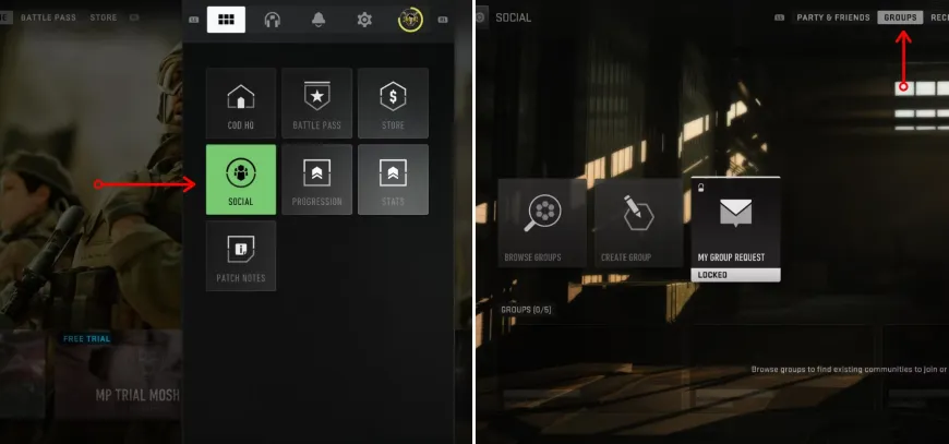 Чтобы присоединиться к группе, игроки должны перейти на вкладку "Social" в главном меню. Откроется социальное меню, где игроки могут управлять своими друзьями, группами и недавними матчами. Игроки должны выбрать вкладку "Группы", которая откроет новое меню с тремя опциями: Просмотреть группы, Создать группу и Мой запрос на группу.