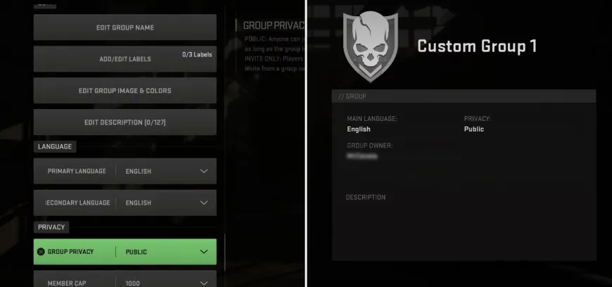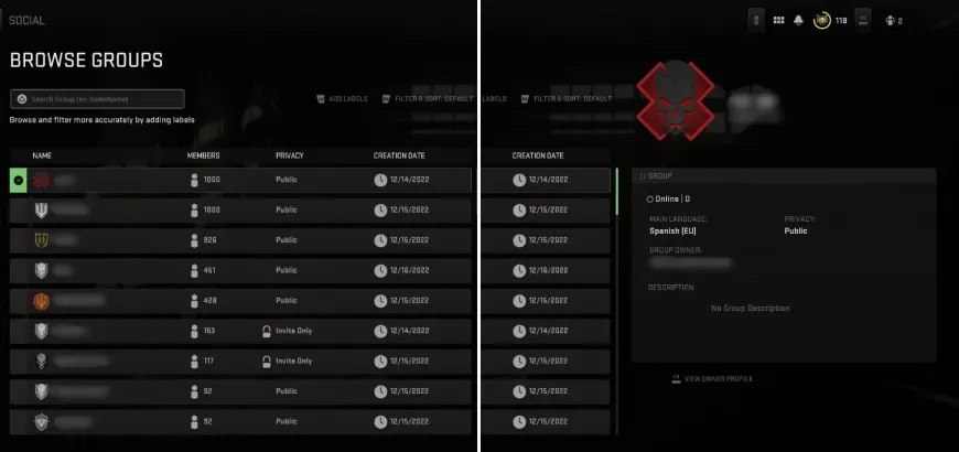 После выбора пункта "Просмотреть группы" игроки смогут просмотреть все доступные группы в Call of Duty Modern Warfare 2 и Call of Duty Warzone 2. Игроки могут искать конкретное название группы (если они нашли понравившуюся на форуме, например, Reddit) или прокручивать доступные группы. Кроме того, игроки могут добавлять метки (рейды, Warzone и т.д.) или фильтровать по конфиденциальности (публичная или только по приглашениям), количеству участников и основному/второму языку.
