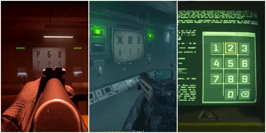 Игроки должны знать, что иногда будут появляться четыре русские буквы, но это не имеет значения, пока игроки правильно вводят первые три цифры. После ввода последней последовательности кодов откроется дверь перед комнатой управления.