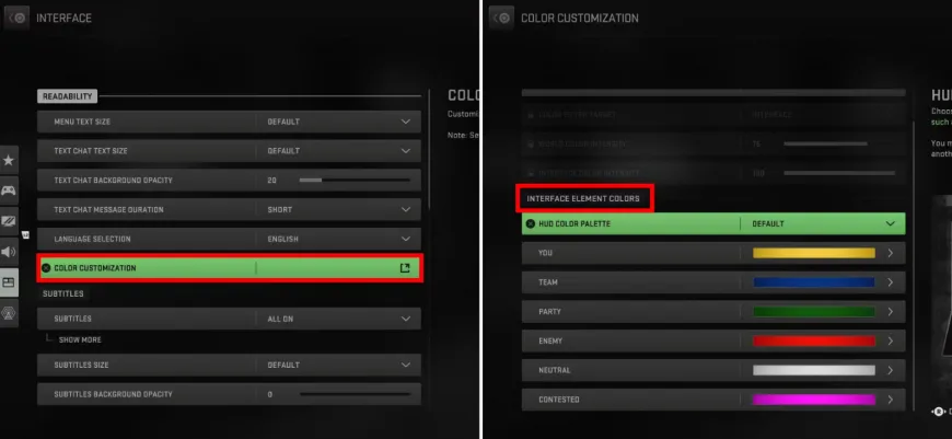 В главном меню (где игроки могут играть в COD: Modern Warfare 2 Multiplayer, DMZ и Warzone 2) игроки должны перейти в меню настроек (первое изображение; слева). Оказавшись в меню настроек, игроки должны выбрать пункт Interface (первое изображение; справа), что приведет их на другой экран. В меню Интерфейс выберите опцию Настройка цвета (второе изображение слева). В этом новом меню найдите раздел Цвета элементов интерфейса (второе изображение; справа).