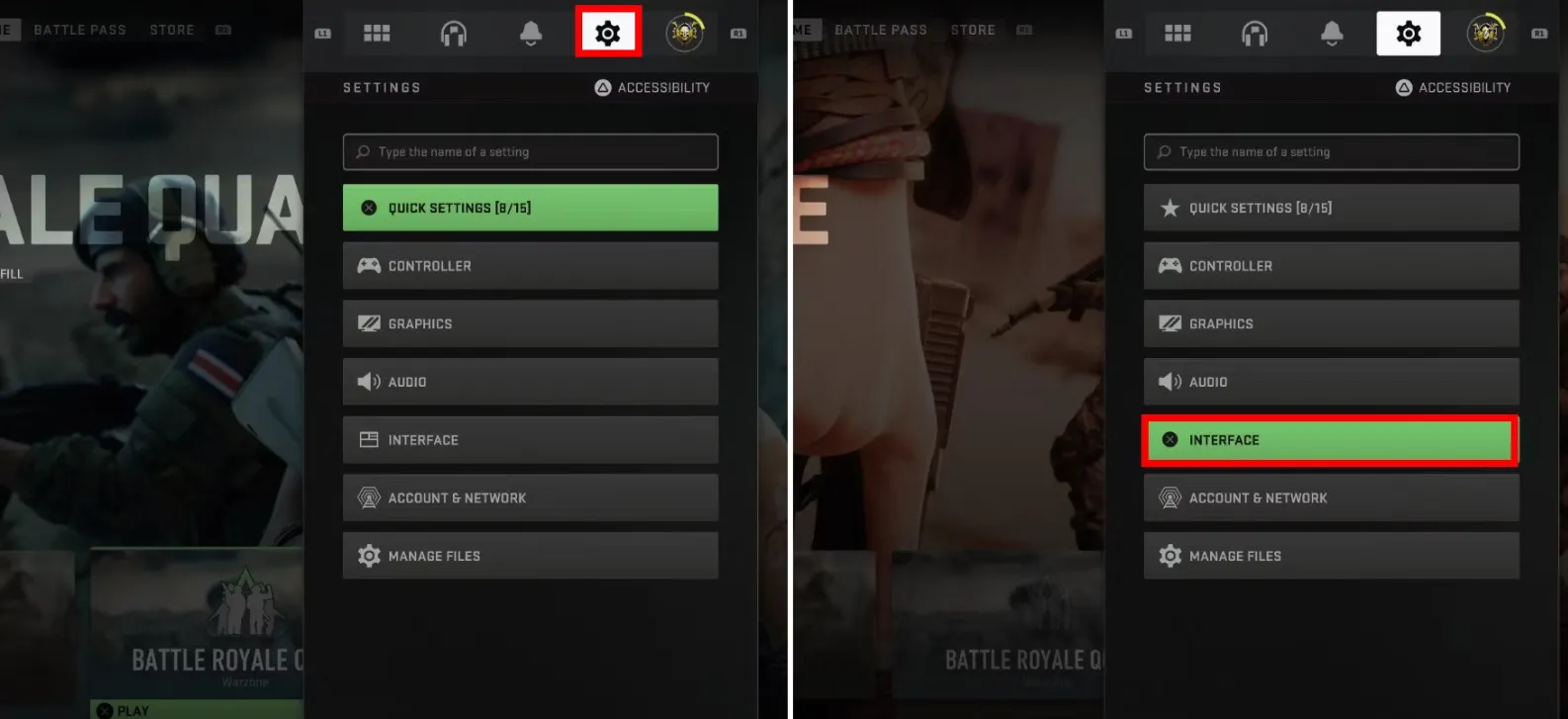 В главном меню (где игроки могут играть в COD: Modern Warfare 2 Multiplayer, DMZ и Warzone 2) игроки должны перейти в меню настроек (первое изображение; слева). Оказавшись в меню настроек, игроки должны выбрать пункт Interface (первое изображение; справа), что приведет их на другой экран. В меню Интерфейс выберите опцию Настройка цвета (второе изображение слева). В этом новом меню найдите раздел Цвета элементов интерфейса (второе изображение; справа).