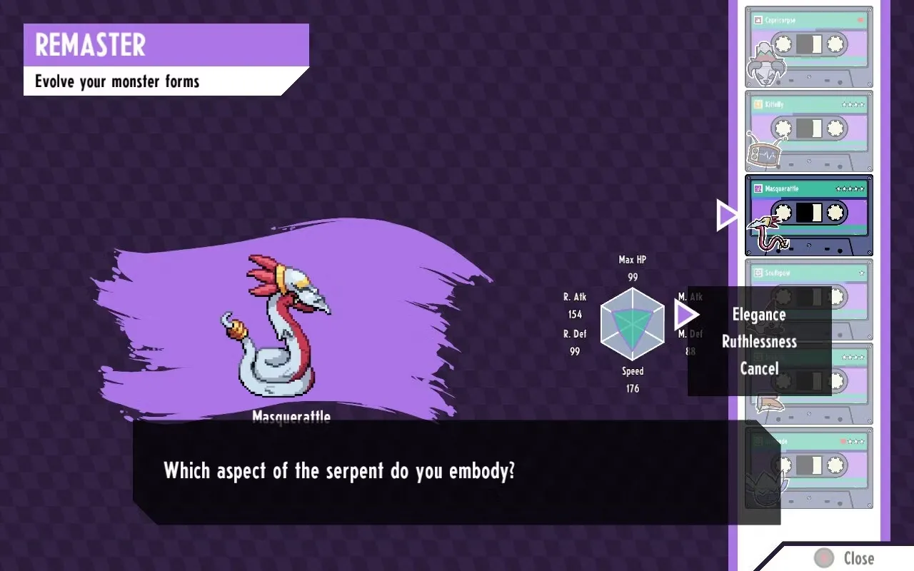 Хотя многие монстры становятся ремастерами после еще одного подтверждения, иногда игрокам будет предложено выбрать один из нескольких вариантов при нажатии кнопки ввода ремастера. Наличие такого выбора указывает на то, что монстр способен эволюционировать в несколько форм, и выбор игрока в конечном итоге определяет, какую форму примет существо. Хотя игроки должны чувствовать себя свободно, делая эти выборы без какой-либо информации извне, вики-сайт Cassette Beasts предоставляет подробную информацию о формах, которые порождает каждый выбор.