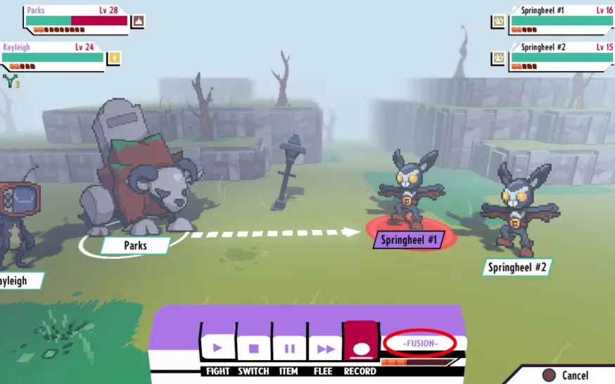 После заполнения счетчика слияния игроки могут выполнить слияние в любой битве, нажав кнопку Fuse на правой стороне магнитофона. В результате два монстра Cassette Beasts, находящиеся на поле боя, объединятся в одного монстра, который будет обладать следующими свойствами: