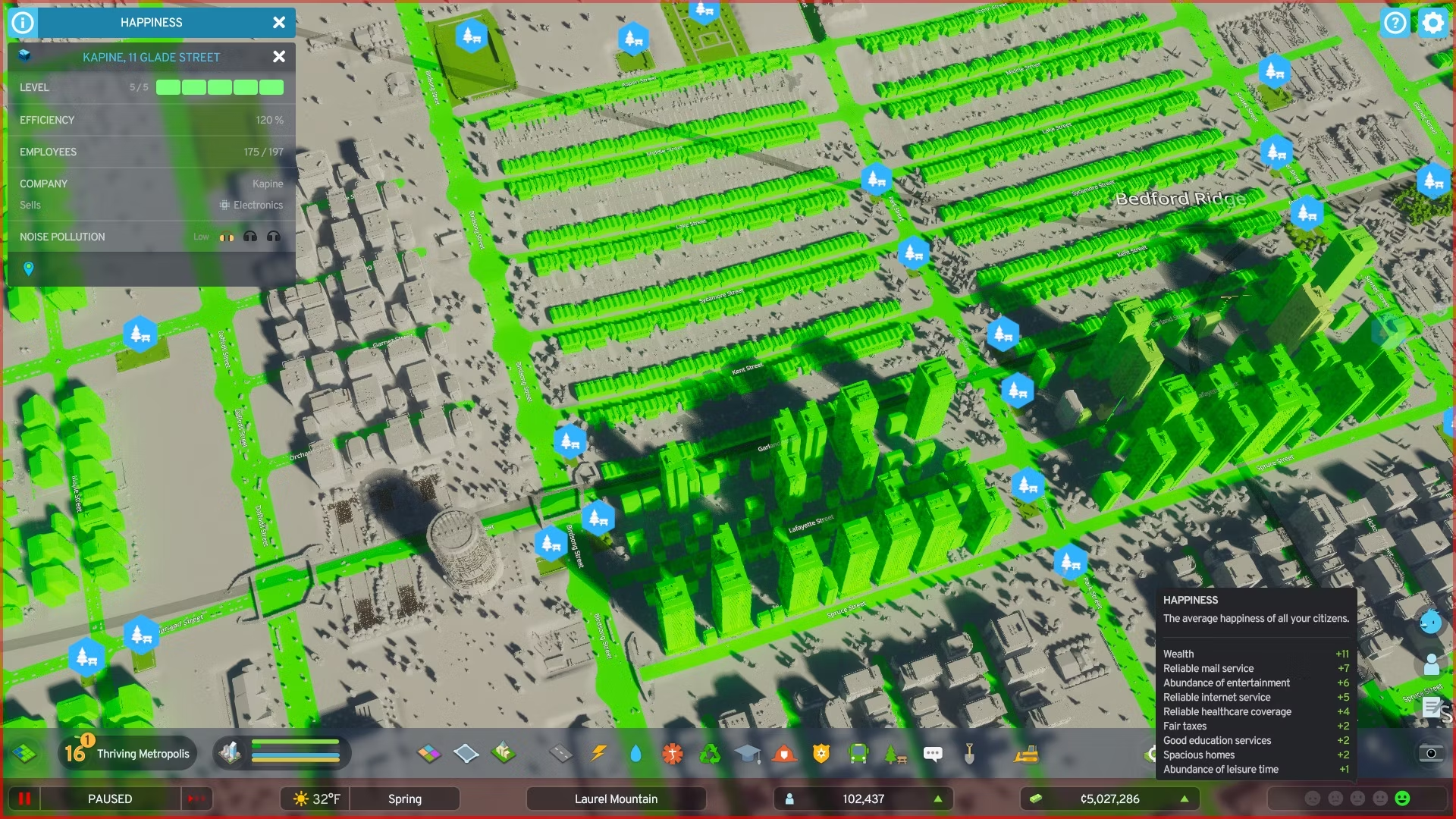 Счастье (тесно связанное с другим показателем, Благосостояние) - один из самых важных показателей в игре. Счастливое население больше работает, меньше жалуется и менее склонно к переезду из города. Для поддержания этого показателя игроки должны предоставлять своим жителям все возможные услуги и защиту. Влияние на уровень счастья включает в себя: