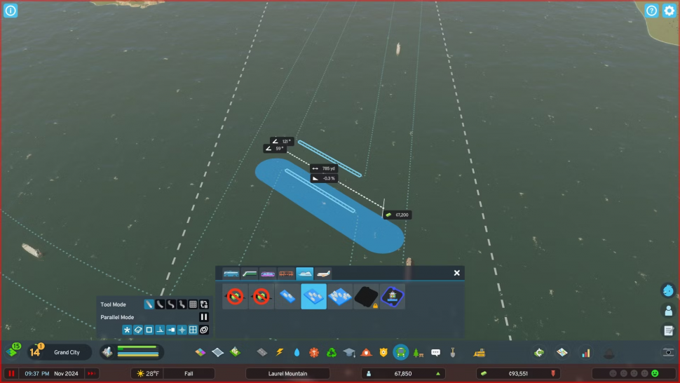 Далее игроки должны построить хотя бы один грузовой или паромный док. Это открывает доступ к судоходным путям, которые можно строить и модифицировать с помощью тех же инструментов, что и при строительстве дорог. Основное отличие заключается в том, что судоходные пути не меняют ничего физически, а лишь показывают зоны, по которым разрешено движение судов. Несмотря на это, строительство судоходной трассы может обойтись в кругленькую сумму.