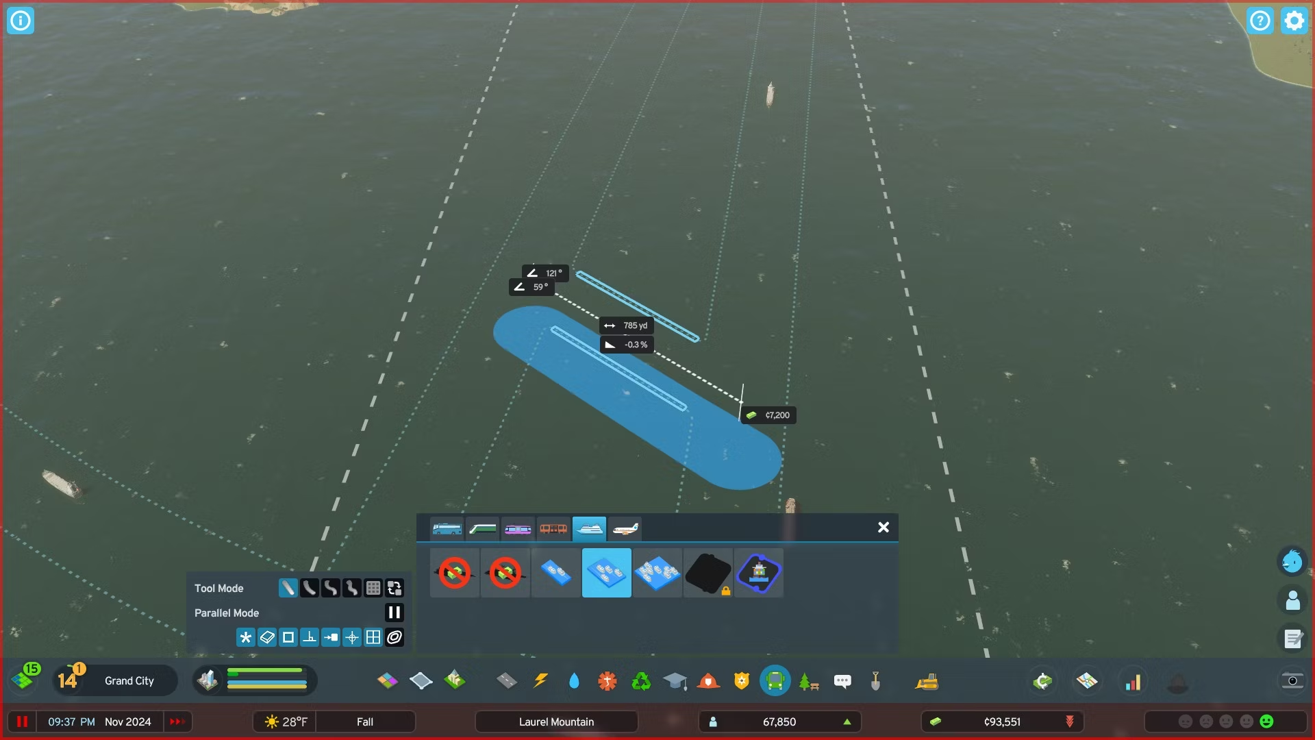 Далее игроки должны построить хотя бы один грузовой или паромный док. Это открывает доступ к судоходным путям, которые можно строить и модифицировать с помощью тех же инструментов, что и при строительстве дорог. Основное отличие заключается в том, что судоходные пути не меняют ничего физически, а лишь показывают зоны, по которым разрешено движение судов. Несмотря на это, строительство судоходной трассы может обойтись в кругленькую сумму.