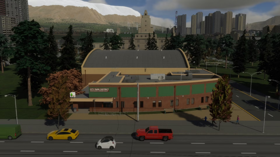 Одно здание для обслуживания парков стоит не очень дорого и может обслуживать большое количество парков, но для этого оно отправляет грузовики по дорожной сети. Это означает, что для своевременного выполнения работы они полагаются на хорошее движение по городу, но как городской транспорт они могут ездить по пешеходным дорогам и другим местам, куда обычные автомобили не могут заезжать.