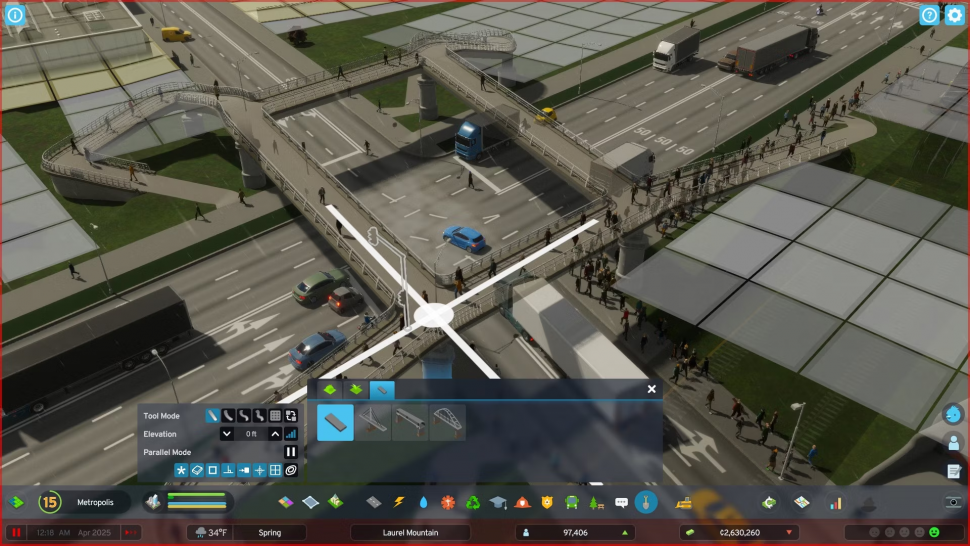 Если на перекрестке наблюдается большой поток пешеходов благодаря расположенной рядом станции метро или автостоянке, игроки могут захотеть полностью убрать их с дорог. Для этого можно сделать надземную пешеходную дорожку.