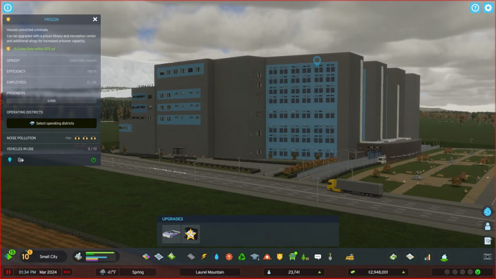 И последнее, что необходимо учитывать, - это площадь тюрем и тюремных помещений. В каждом полицейском участке и штабе имеется тюрьма - место, где арестованные преступники могут дожидаться суда. В Cities: Skylines 2 учитывает это отдельно от тюрем, в которых осужденные преступники отбывают наказание. В городе должно быть достаточно места для содержания обоих типов заключенных, даже если благодаря хорошей профилактике преступности заключенных, которым необходимо провести время за решеткой, не так много.