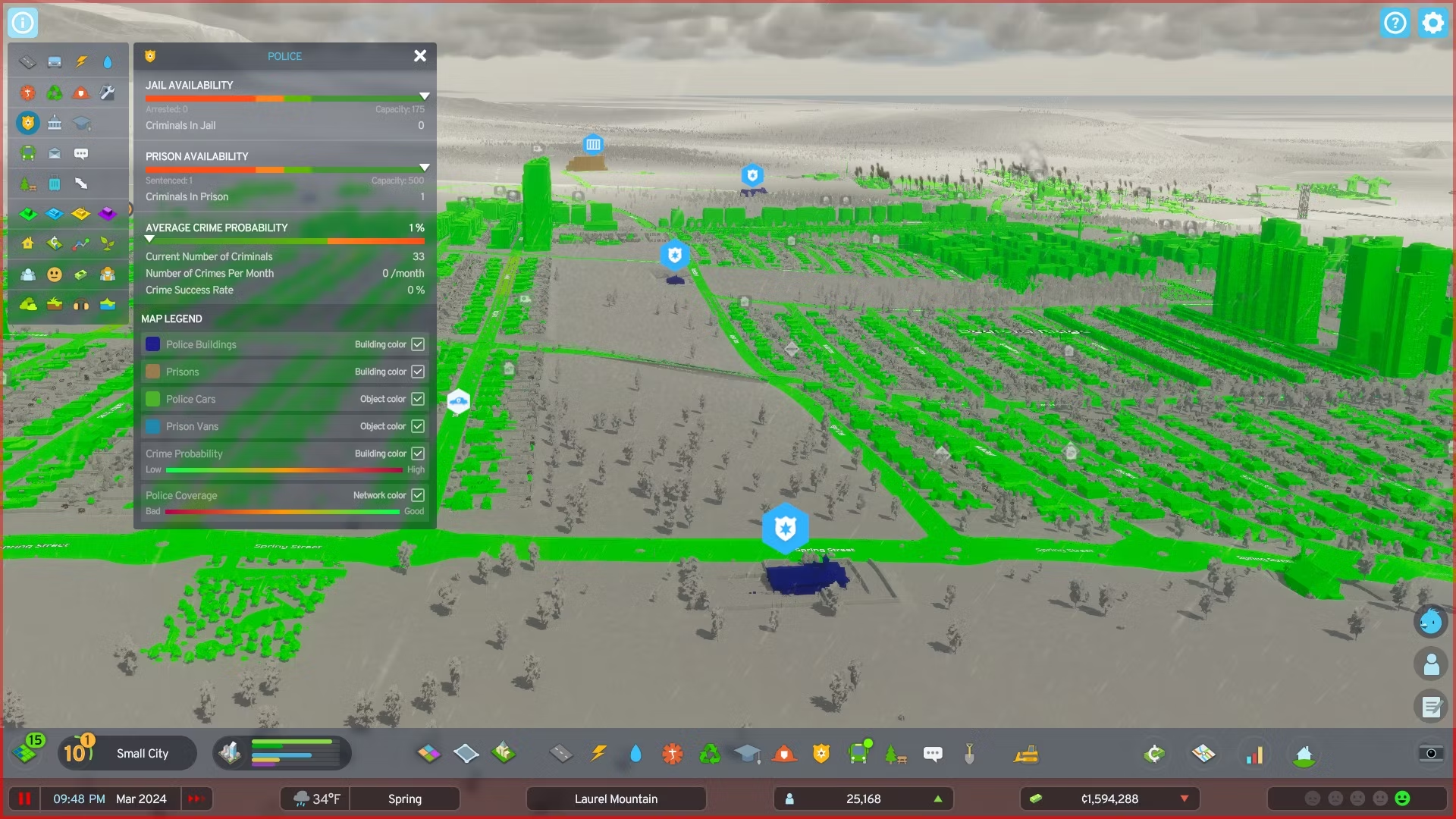 Но даже при наличии всех этих преимуществ игрокам все равно следует держать несколько постов в стратегически важных местах вокруг штаб-квартиры. Полиция зависит от хорошего дорожного движения, чтобы добраться до места преступления и остановить преступников, поэтому частые пробки и плохие дороги могут повысить коэффициент раскрываемости преступлений и заставить граждан жаловаться на преступность, даже если средняя вероятность преступлений снизится до 1%.