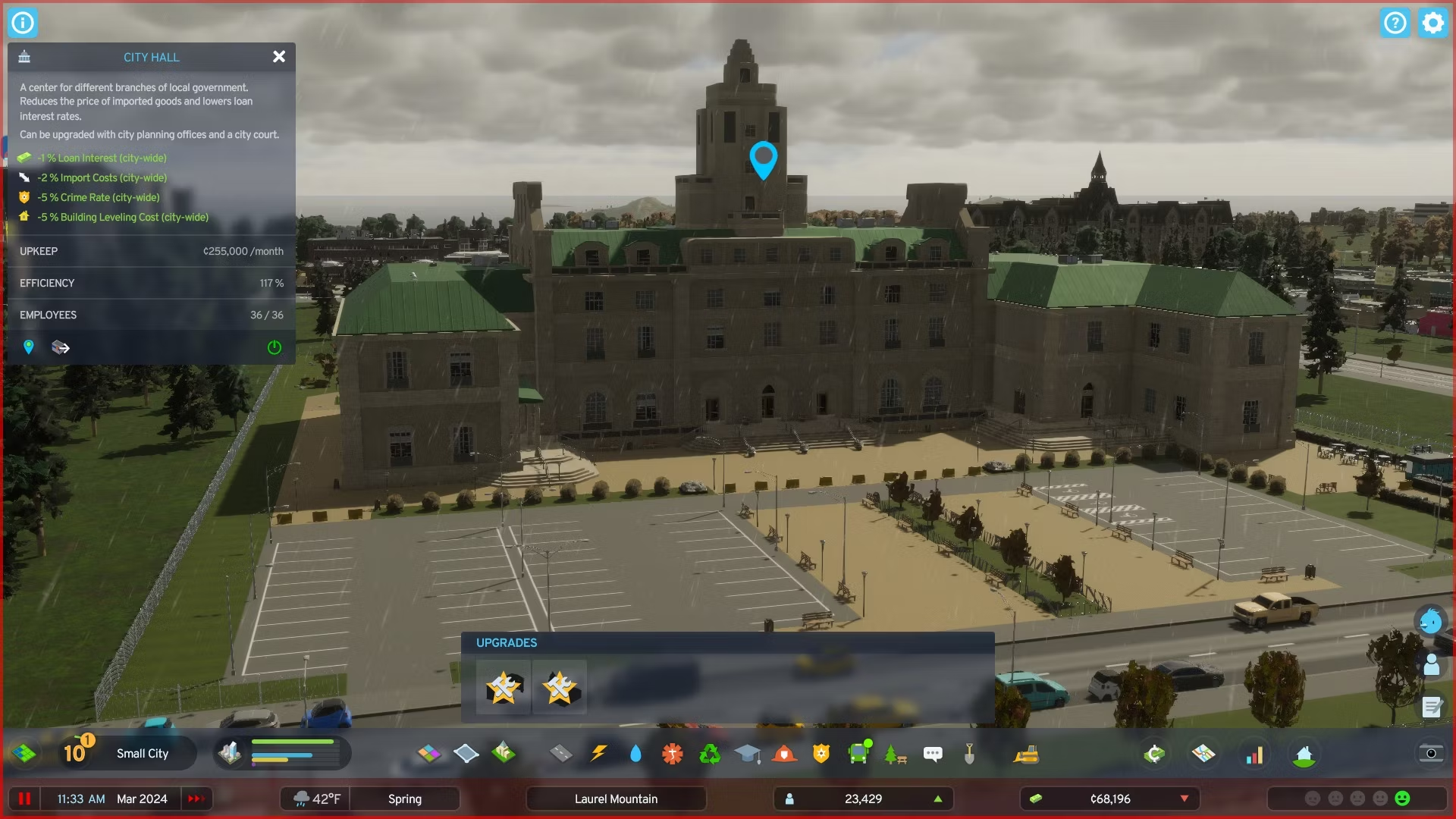 Еще одно полезное здание - мэрия. Мэрия снижает процентные ставки по кредитам и стоимость импорта коммунальных услуг на небольшой процент, но игроки также могут добавлять улучшения, удешевляющие модернизацию зданий, и снижать уровень преступности во всем городе на 5%. Как и офис социального обеспечения, это здание не влияет на трафик, но игроки могут построить только одно такое здание на город.