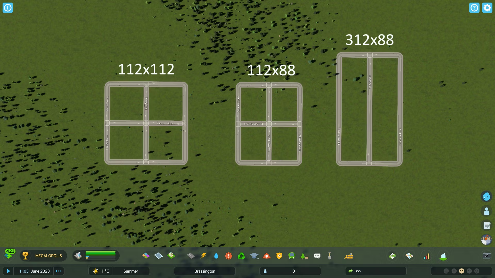 Существует несколько способов подбора сетки, но при проектировании районов игроки всегда должны помнить об эффективности использования пространства и пешеходной связности. При зонировании на максимальную плотность игроки должны стараться не оставлять свободных мест в своих районах.