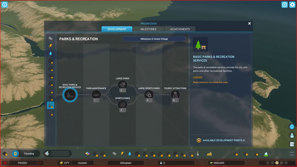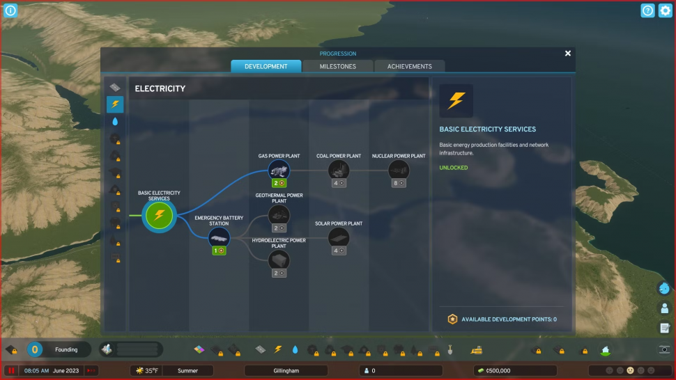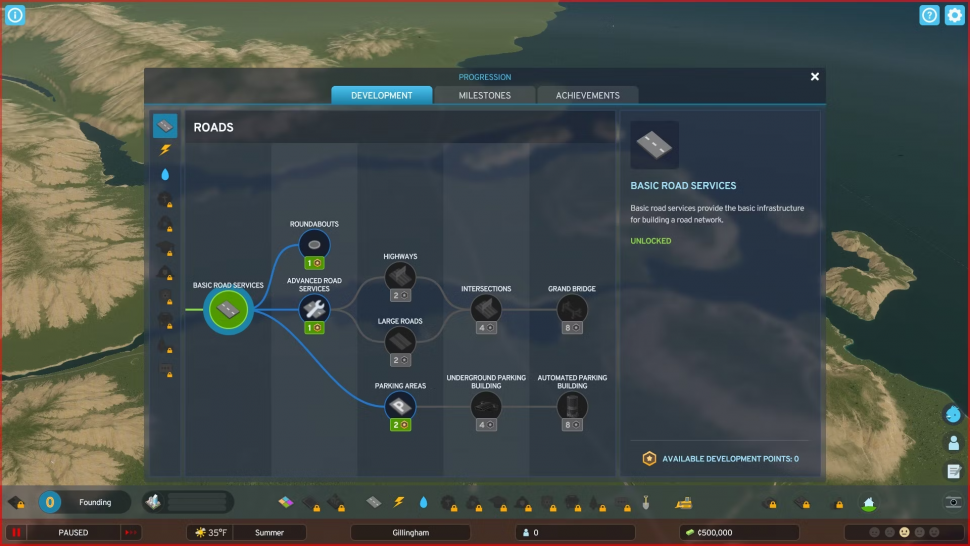 Дороги, электричество, водоснабжение и канализация разблокированы в начале игры, но для того, чтобы получить очки, которые можно потратить на эти цели, игроку необходимо достичь первого рубежа.