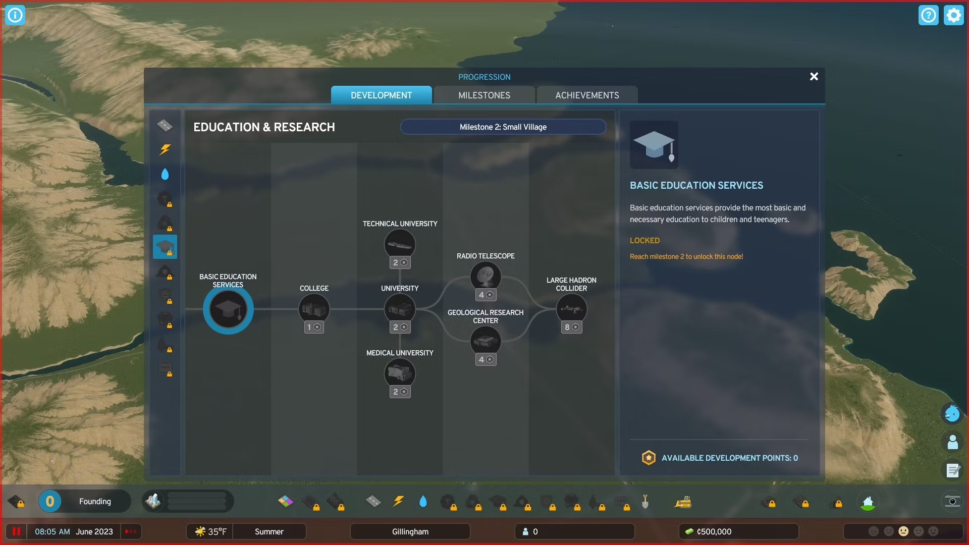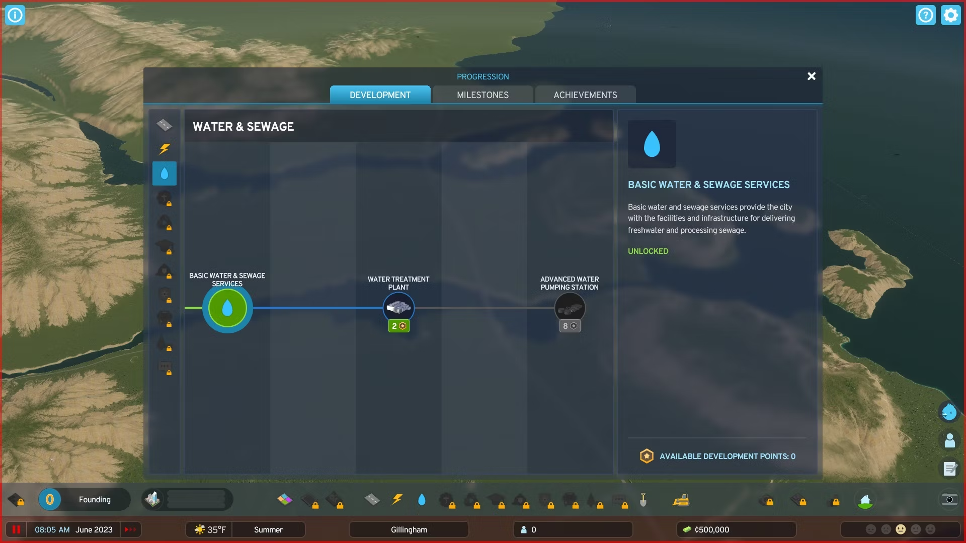 Дороги, электричество, водоснабжение и канализация разблокированы в начале игры, но для того, чтобы получить очки, которые можно потратить на эти цели, игроку необходимо достичь первого рубежа.