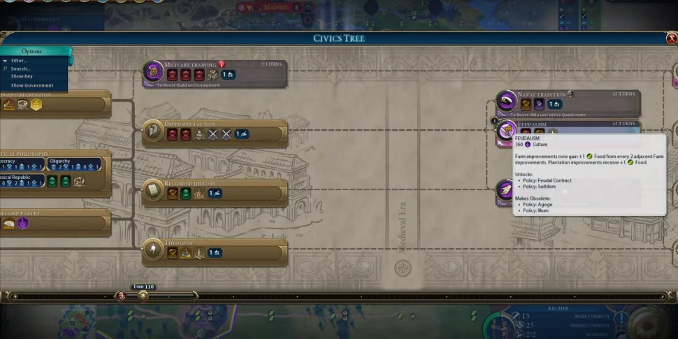 Как только игрок разблокирует гражданское дерево прогресса "Феодализм", фермы будут получать дополнительно +1 еды, если они расположены рядом с двумя другими фермами. Это улучшается еще больше, когда игрок исследует технологию "Заменяемые детали", которая модернизирует фермы в механизированное сельское хозяйство и добавляет к предыдущим бонусам еще +1 еды за каждую соседнюю ферму.