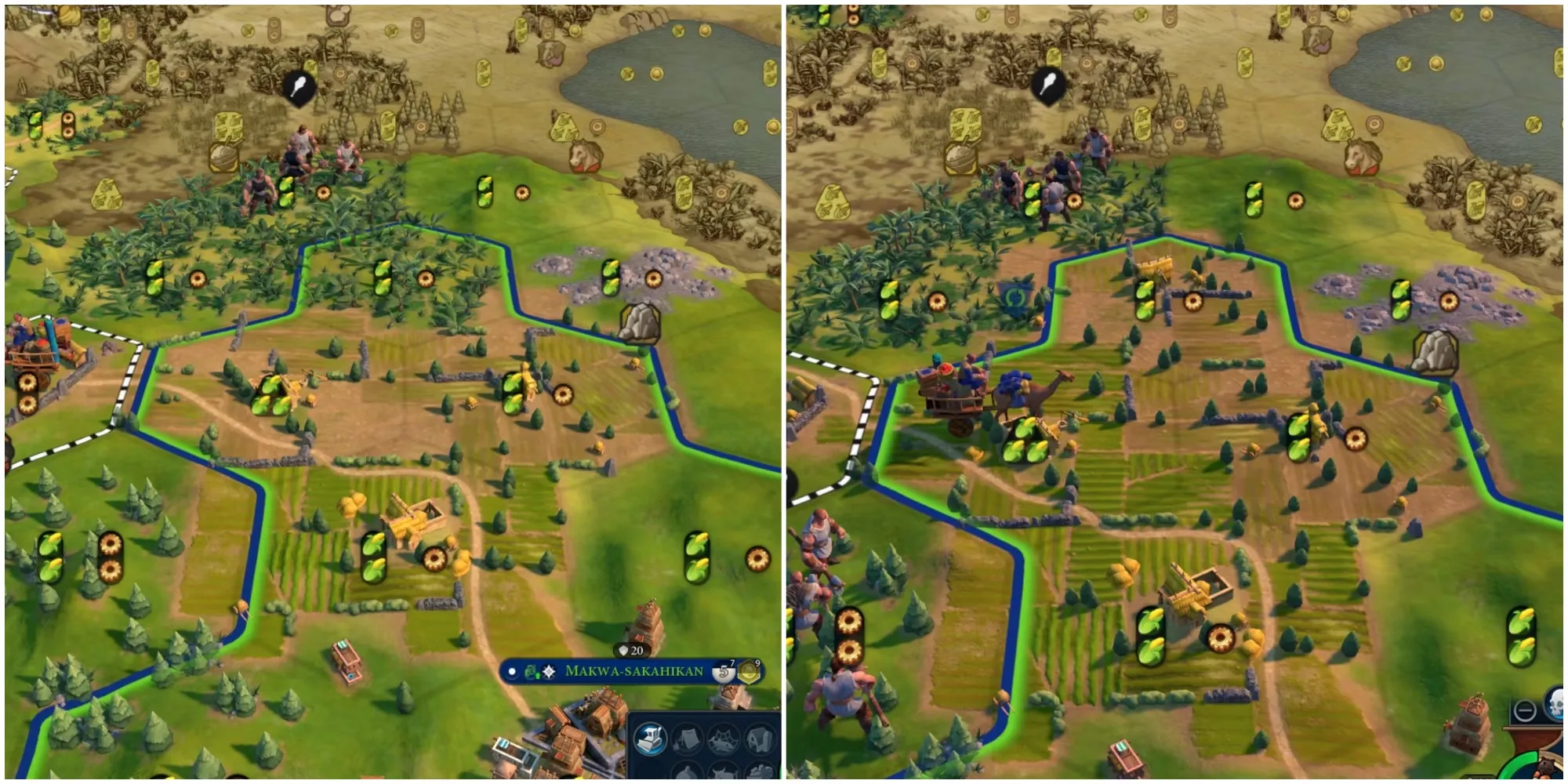 Как только игрок разблокирует гражданское дерево прогресса "Феодализм", фермы будут получать дополнительно +1 еды, если они расположены рядом с двумя другими фермами. Это улучшается еще больше, когда игрок исследует технологию "Заменяемые детали", которая модернизирует фермы в механизированное сельское хозяйство и добавляет к предыдущим бонусам еще +1 еды за каждую соседнюю ферму.