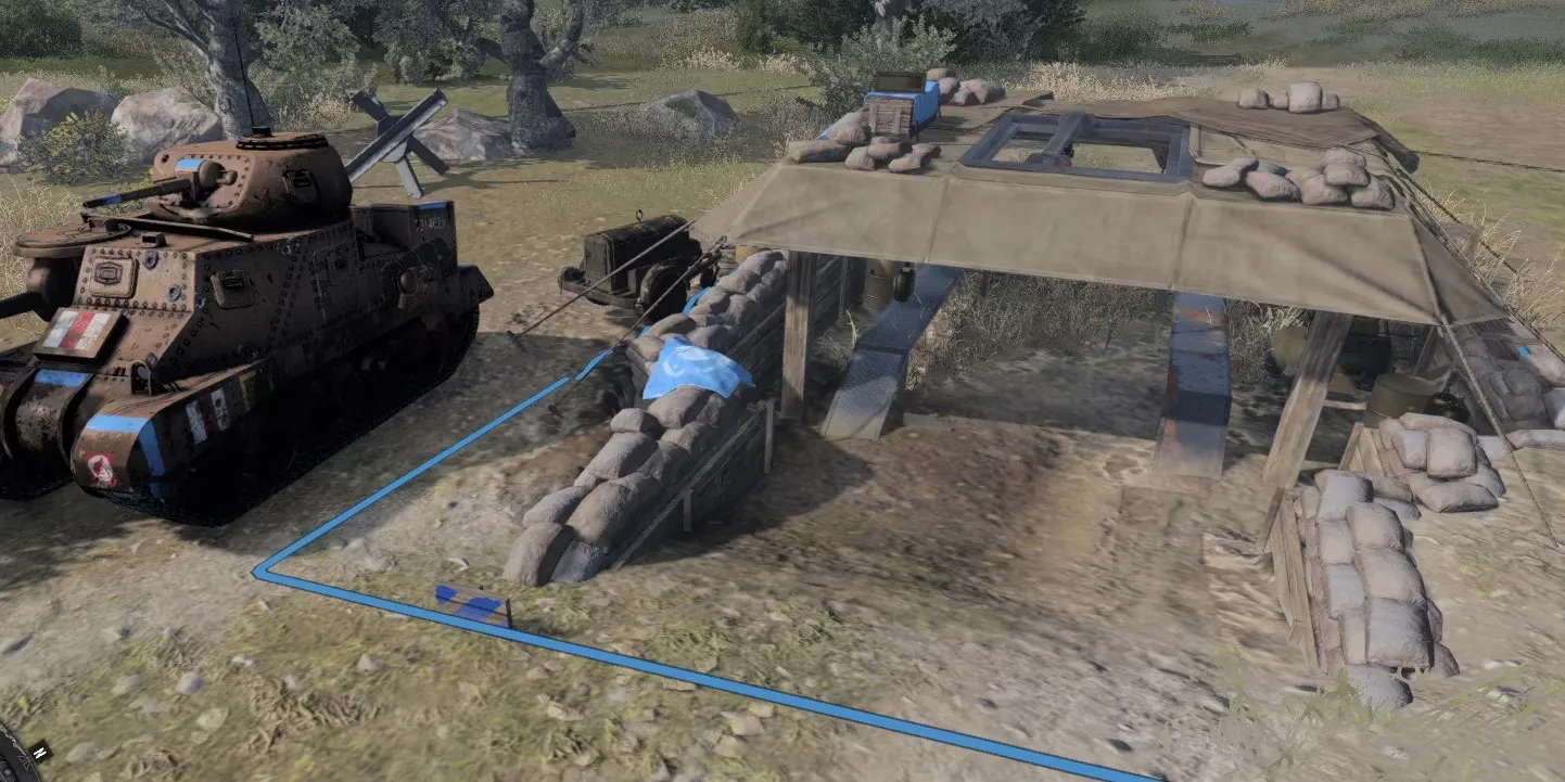 - Можно строить мешки с песком для плотного укрытия, колючую проволоку для блокирования пехоты, танковые ловушки для блокирования техники, мины общего назначения (30 боеприпасов каждая) или тайник ресурсов (200 рабочей силы), который может защитить и увеличить доход от захваченной точки.