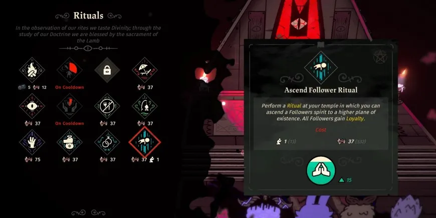 Когда игроки начнут создавать свою общину в Cult of the Lamb, они обнаружат, что в ней довольно много движущихся частей. По мере того как ягненок улучшает Красную корону, он начинает открывать доступ к многочисленным характеристикам, способностям, рецептам и, самое главное, ритуалам. Два из этих ритуалов, в частности, очень важны для роста самого Ягненка и могут поддерживать процветание и верность Культа. Те, кто развивает отношения со своими последователями, могут накопить тонны EXP для развития своей общины, принося в жертву и вознося культистов при любой возможности.