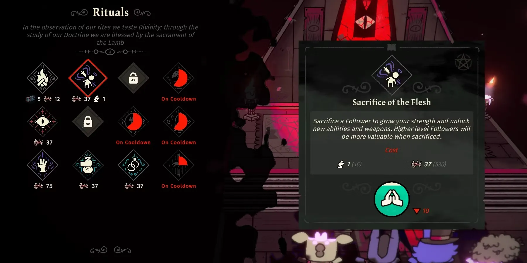 Игроки, которые хотят стать достаточно сильными, чтобы покорить каждый крестовый поход, захотят как можно скорее разблокировать способность приносить в жертву последователей. Чтобы получить возможность провести ритуал жертвоприношения, игрокам необходимо пройти Крестовый поход в Темнолесье, пока они не найдут и не победят второго мини-босса. После этого им придется столкнуться с Тем, Кто Ждет, который вознаградит Ягненка новой возможностью под названием Жертвоприношение Плоти. Это даст игрокам возможность активировать ритуал, когда они захотят, на своем церковном алтаре и самим выбрать последователя для принесения в жертву Старому Богу.