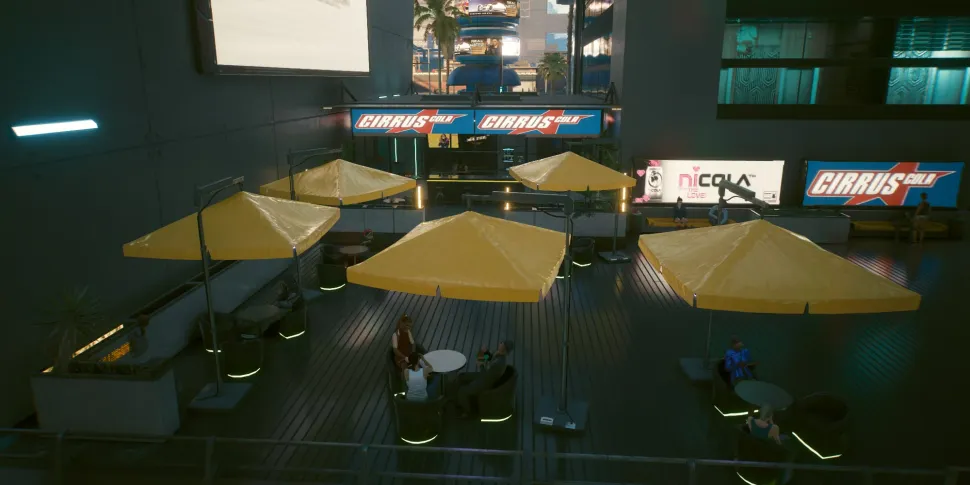 Ищите прилавок с едой и желтыми зонтиками. Игроки могут перепрыгнуть через зонтики, чтобы забраться на крышу киоска, если у них нет модификации двойного прыжка.