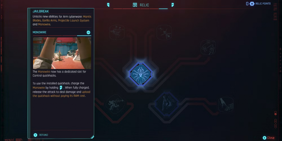 Игрокам необходимо разблокировать перк "Побег из тюрьмы", чтобы применить быстрые атаки на Monowire. Этот перк находится в совершенно новом дереве навыков Relic, добавленном в Phantom Liberty. Начните расширение со встречи с Songbird, и она даст V три очка Relic, которые можно потратить. Еще больше очков Relic можно найти в районе Dogtown, разбросанных по всему расширению. Перк "Побег из тюрьмы" также добавляет новые способности к каждой руке кибера.