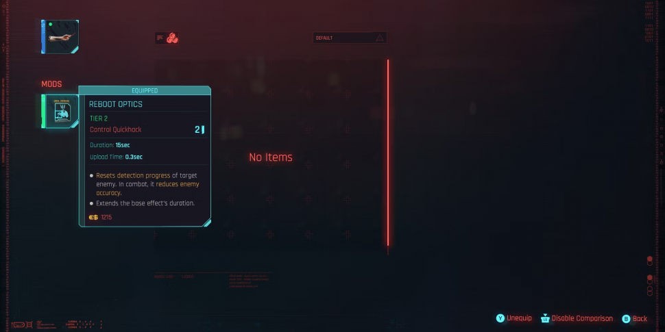 Это приведет игрока к экрану, на котором можно установить доступные быстрые хаки. Высокоуровневые хаки не могут быть установлены на низкоуровневые монопровода, поэтому не забывайте обновлять снаряжение по мере роста репутации V. Монопровод может использовать только квикхаки управления, которые позволяют взять под контроль киберпространство и оружие противника. Здесь приведен список используемых быстрых атак: