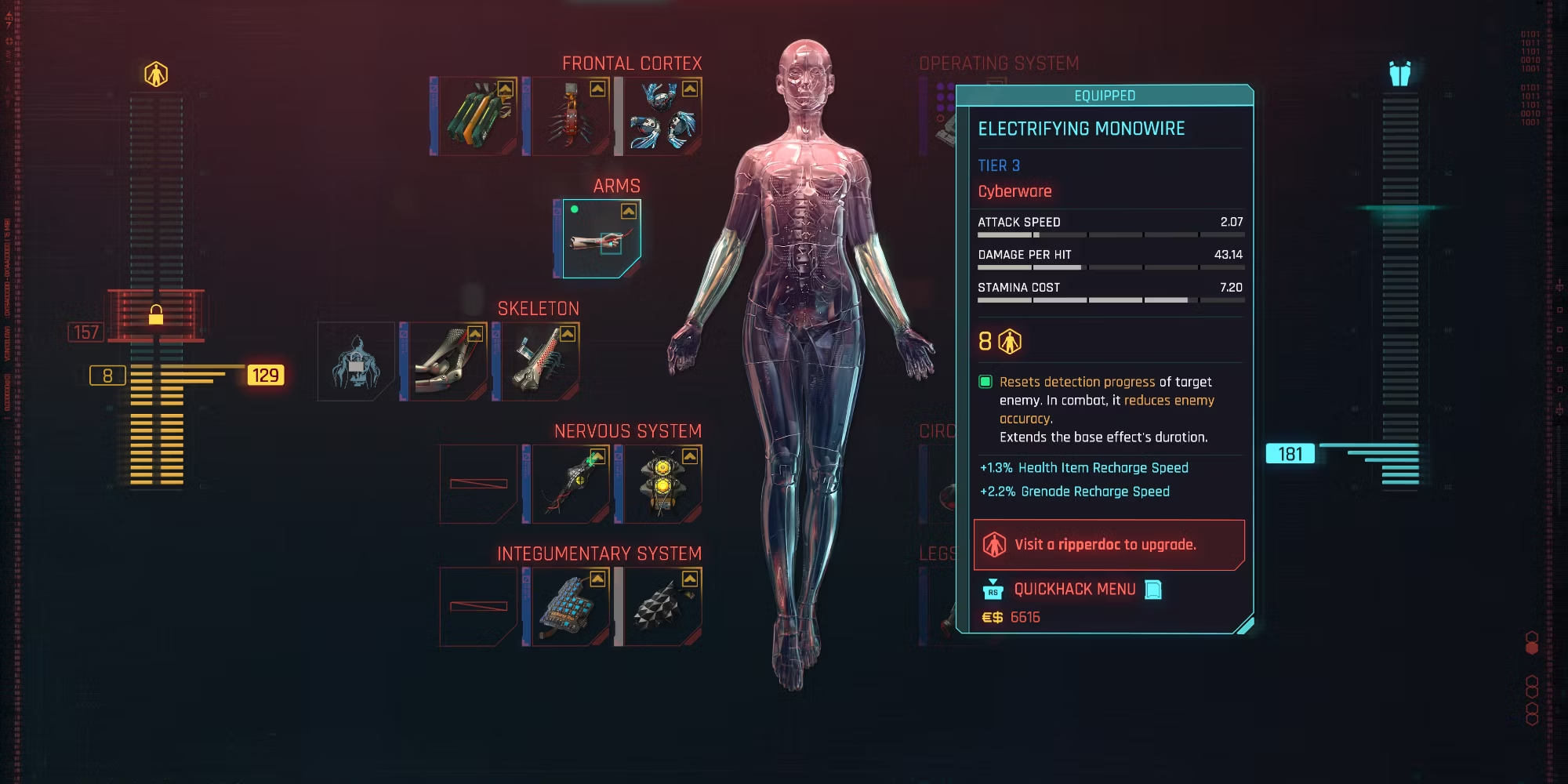 После того как быстрые атаки будут экипированы, настанет время обрушить на врагов разрушительный Monowire. Удерживайте кнопку атаки для сильной атаки, и быстрый удар будет нанесен противнику вместе с базовым уроном. Монопровод имеет самый большой радиус действия среди всех атак ближнего боя и является бесшумным оружием. Экспериментируйте с различными хаками для создания смертоносной сборки нетраннера.