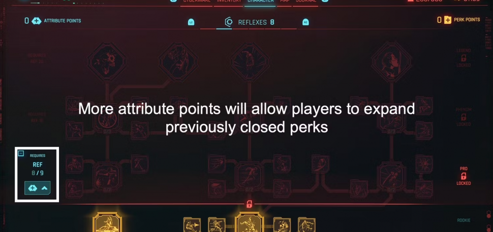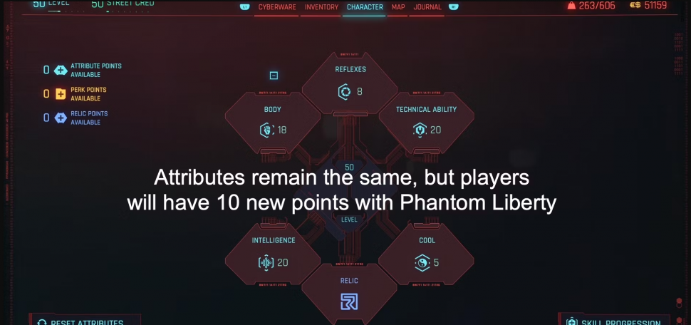 Phantom Liberty вводит в Cyberpunk 2077 новый максимальный уровень очков атрибутов. В базовой игре игрокам было доступно 71 очко атрибутов, а максимальный уровень составлял 50. Это делало невозможным заполнение всех пяти категорий атрибутов, количество которых было - и остается - ограниченным 20.