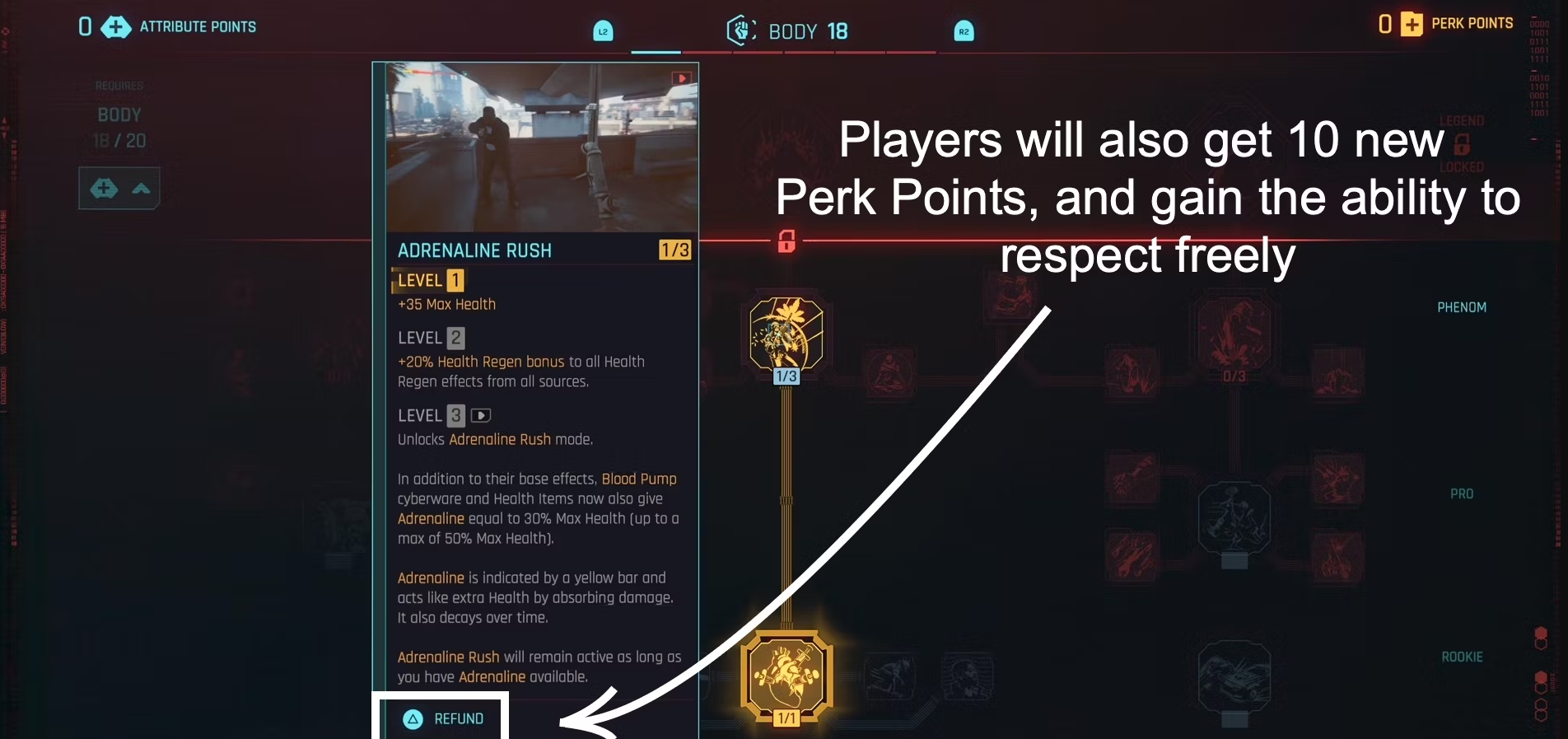 Phantom Liberty сохраняет систему атрибутов базовой игры, которая дает игрокам доступ к пяти различным категориям: Телосложение, Рефлексы, Технические способности, Интеллект и Крутизна. Игроки, отсутствовавшие некоторое время, обнаружат, что в новом обновлении 2.0 - бесплатном и отдельном от Phantom Liberty - была полностью переработана система поощрений. Благодаря этой новой системе и расширению Phantom Liberty игра Cyberpunk 2077 кажется совершенно новой.