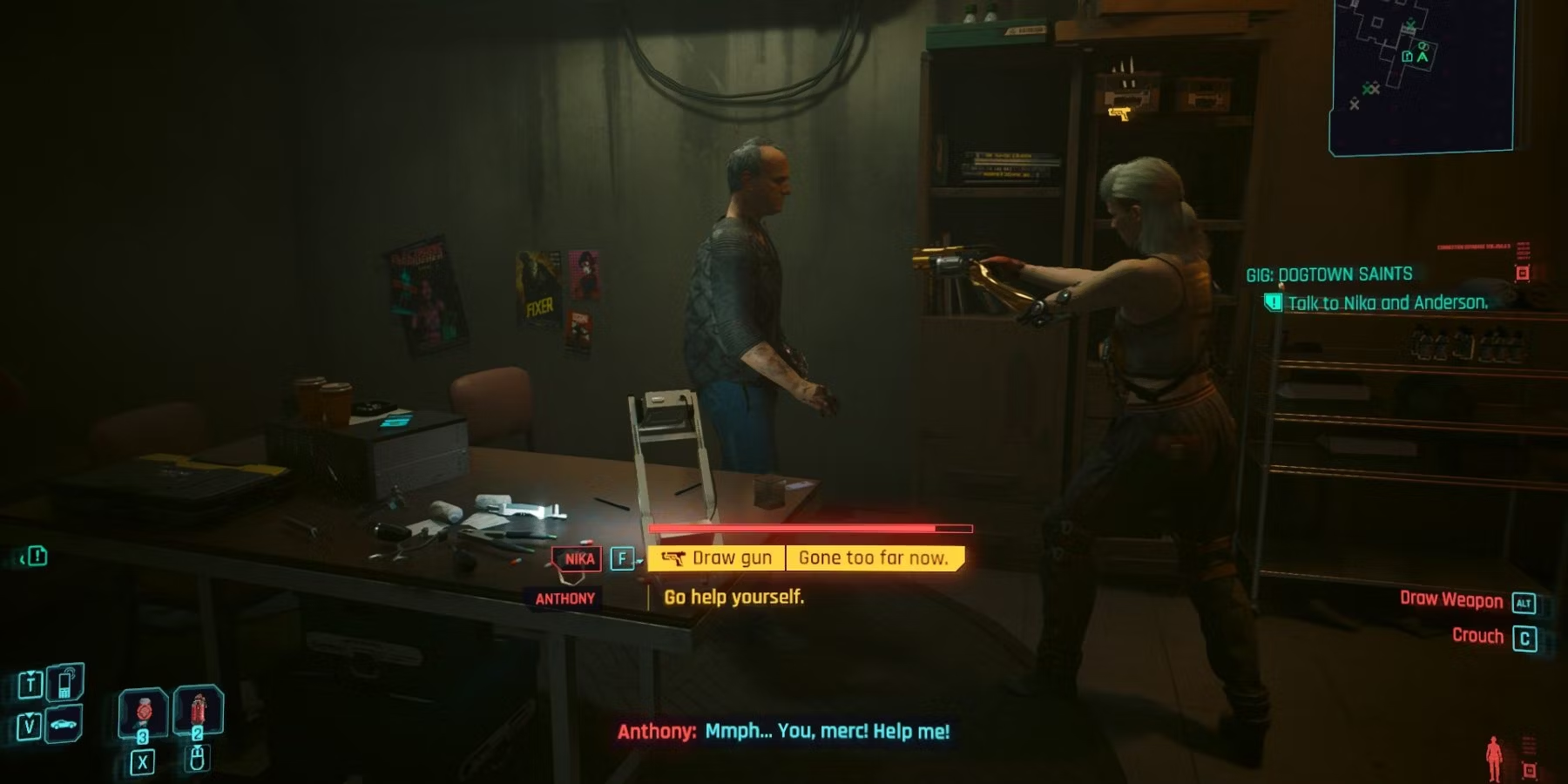 - Они могут продолжить разговор с Никой или достать оружие. Если достать оружие, то Ника обернется против них, и они должны будут убить ее, чтобы спасти Энтони.