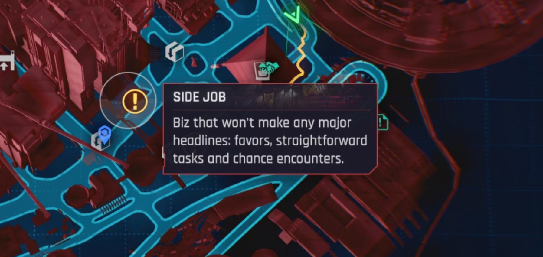 Побочные задания в игре Cyberpunk 2077: Phantom Liberty зачастую являются более подробными, чем задания, и поэтому иногда могут иметь большее значение для сюжета V. Эти задания отмечаются на карте желтым восклицательным знаком в черно-желтом круге.