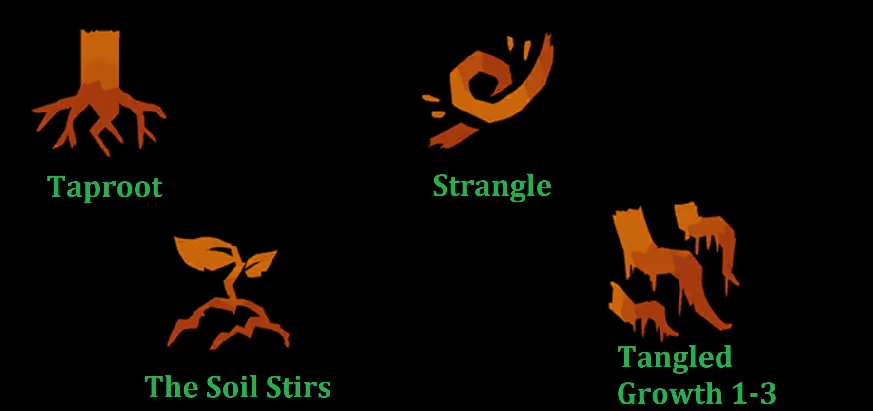- Tangled Growth: Дебафф, накладываемый "Ползучим ростом". При трех стаках становится удушающим. Каждый раз, когда атакуют Tap Root, со случайного члена партии снимается стак.