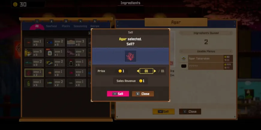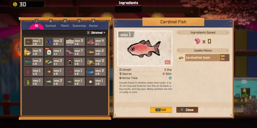 Чтобы получить доступ к меню продажи в этой видеоигре в жанре симулятора ресторана, игроки должны находиться в ресторане суши Bancho Sushi. Находясь там, откройте меню "Ингредиенты". В нем будут отображены все приправы и рыба, доступные в меню. Из этого меню игроки могут продать все доступные ингредиенты и рыбу, которые, по их мнению, им не понадобятся.