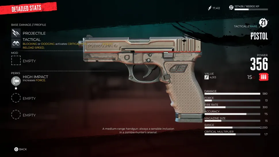 - Мощность - общий уровень оружия, включая моды и бонусы. Обязательно улучшайте огнестрельное оружие или сравнивайте его уровни, чтобы сохранить его пригодность для будущих столкновений.