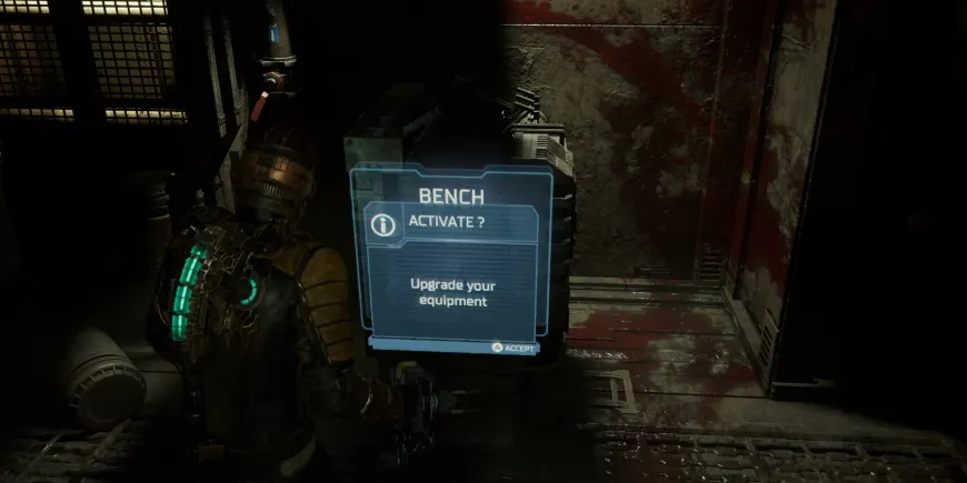Внутри кладовой игроки найдут доску данных. Кроме того, в этой комнате находится узел питания и первая стойка. Как упоминалось ранее, скамьи можно использовать для улучшения оружия и рига Айзека. Поскольку к этому моменту у игроков будет несколько узлов питания, это хорошая возможность улучшить плазменный резак или установку Айзека.