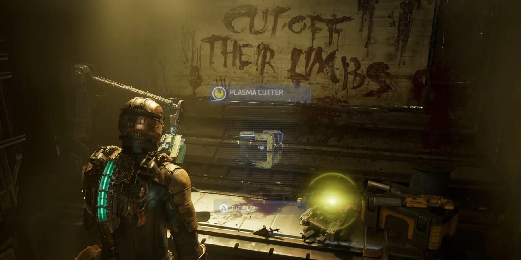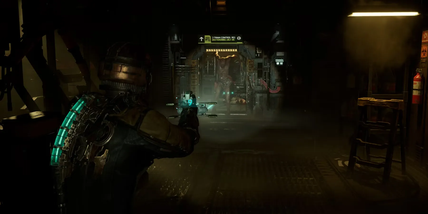 Выйдя из лифта, двигайтесь влево, чтобы найти рабочую станцию с частично собранным плазменным резаком. Возьмите его и начните открывать/разбивать все ящики в комнате, так как патроны и другие ресурсы, которые в них содержатся, будут очень нужны. Когда будете готовы, выстрелите в светящуюся панель рядом с дверью. Когда вы откроете дверь, появится некроморф и нападет на игрока.